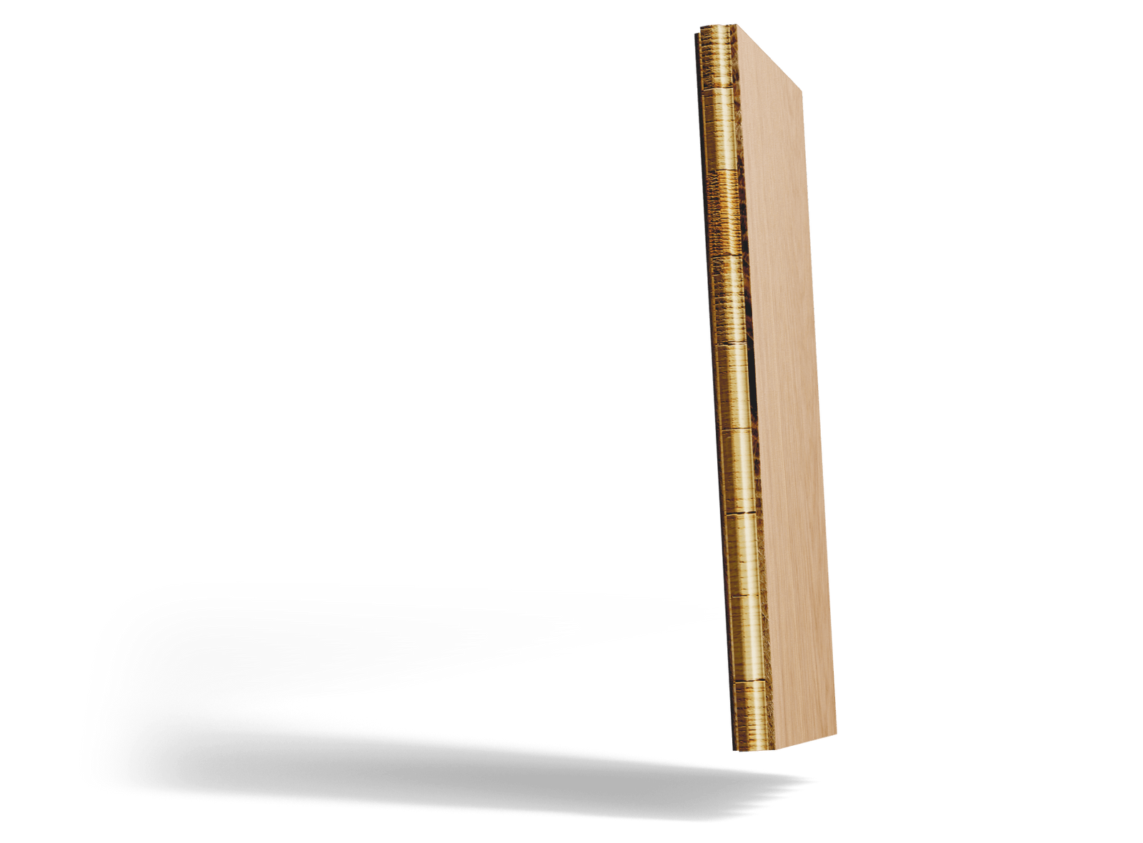 Fast-growing, sustainable, and porous pine strips that expand and contract individually, protecting the top layer of wood. Invented in 1941, this construction is the gold standard in Europe. It’s been performing for lifetimes, which is why we can offer a lifetime warranty.