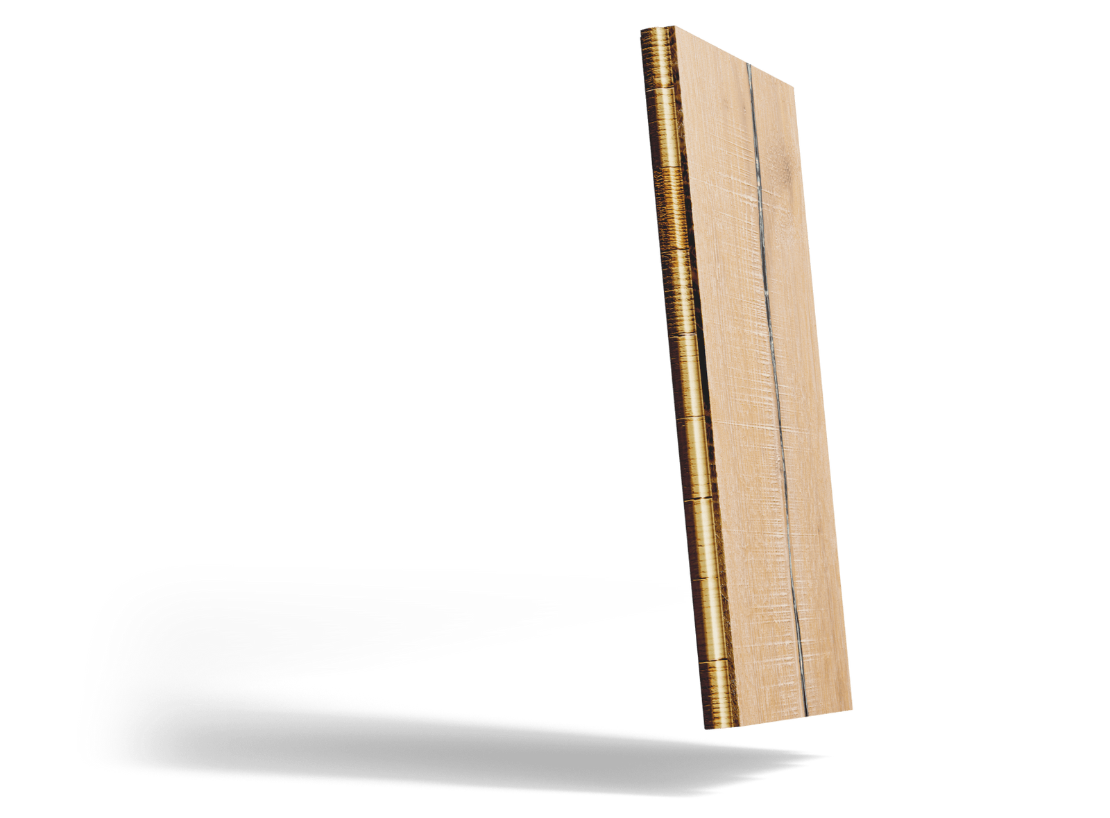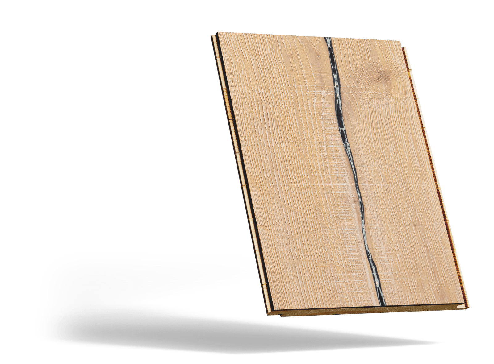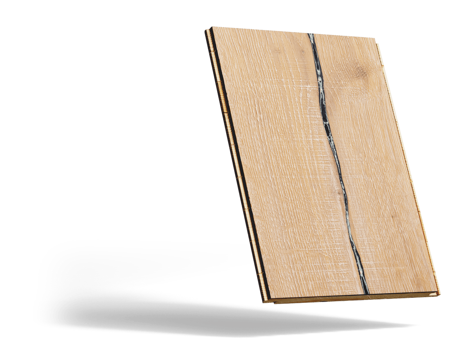 It's fairly character heavy, meaning it will have varying sizes of knots throughout, some up to 3" in size, in addition to cracks that can run the length of each plank. It has very heavy brushing on the board in addition to various saw marks which provides a very grounding feel.