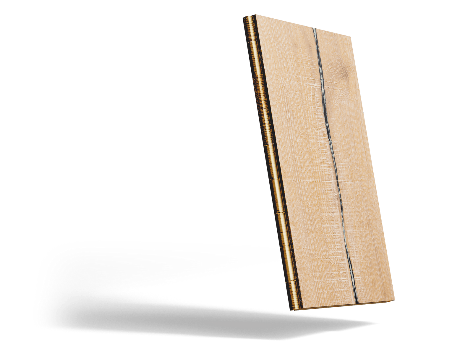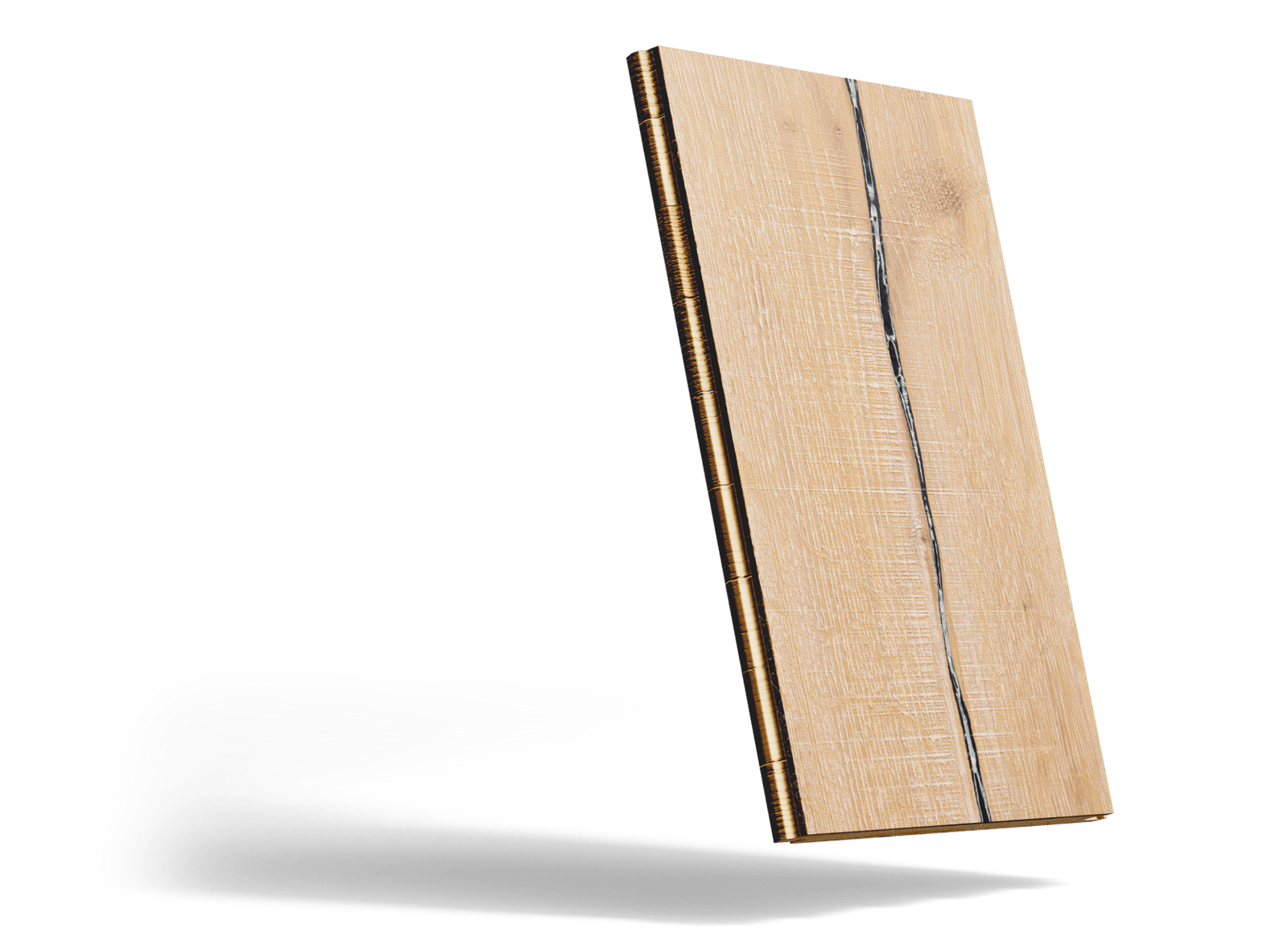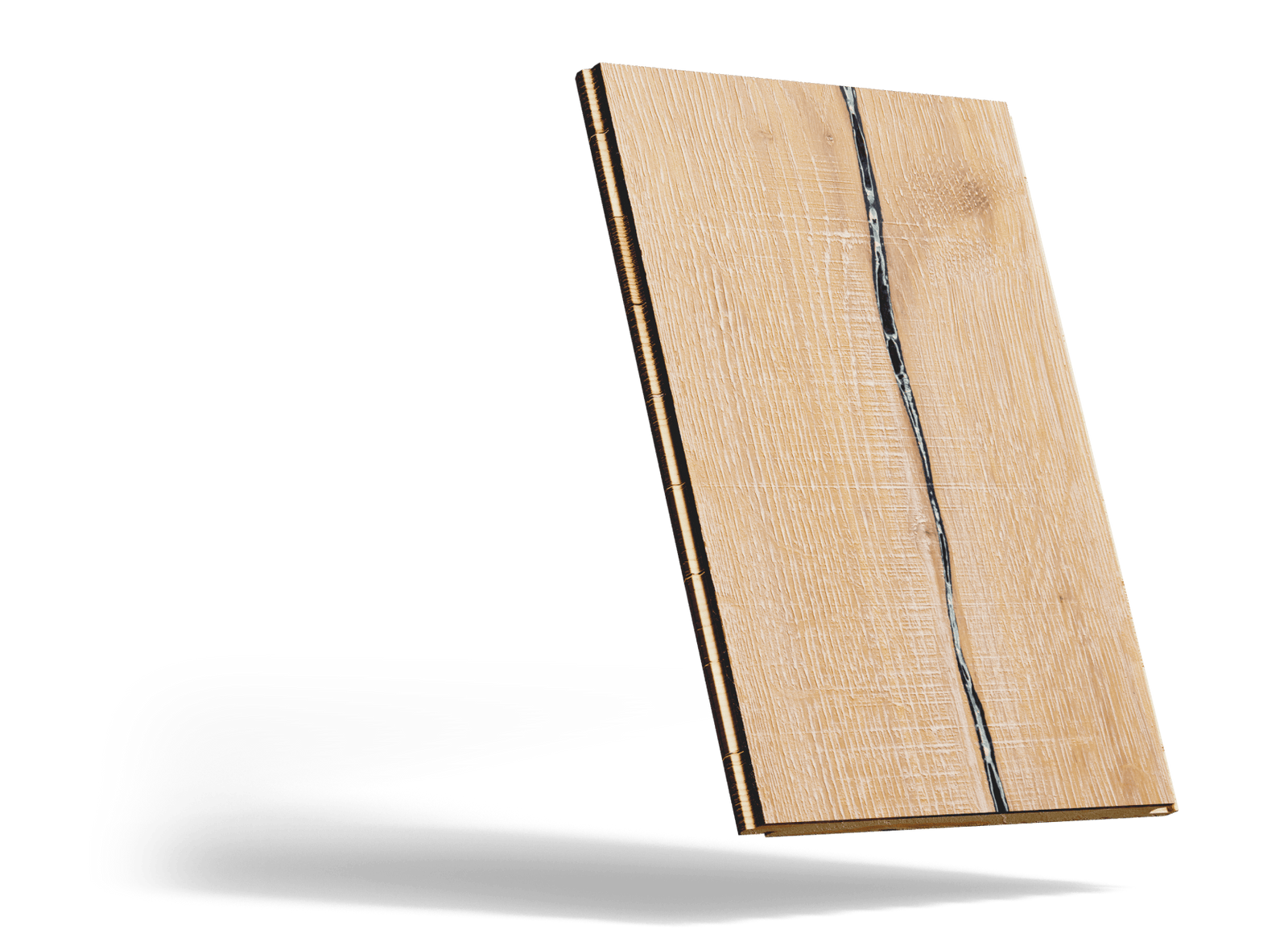 It's fairly character heavy, meaning it will have varying sizes of knots throughout, some up to 3" in size, in addition to cracks that can run the length of each plank. It has very heavy brushing on the board in addition to various saw marks which provides a very grounding feel.